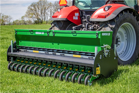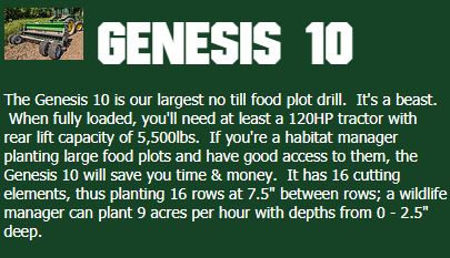 Genesis 10 - 10' No-Till Drill - 120" working width - 16 planting rows with 7.5" Spacing and 15.3 Bushel Capacity Seed Box. Weight = 4,719 lbs. Calibration Mulitplier 41. Optional wheel kit (weight = 800 lbs.) includes hydraulic cylinders, hoses and 4x18x9.5-8 ply tires.